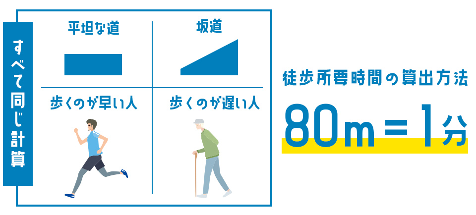 ただし、坂道等は考慮していませんし、人により歩く速さは違いますので、実際に歩いてみることをおすすめします。
